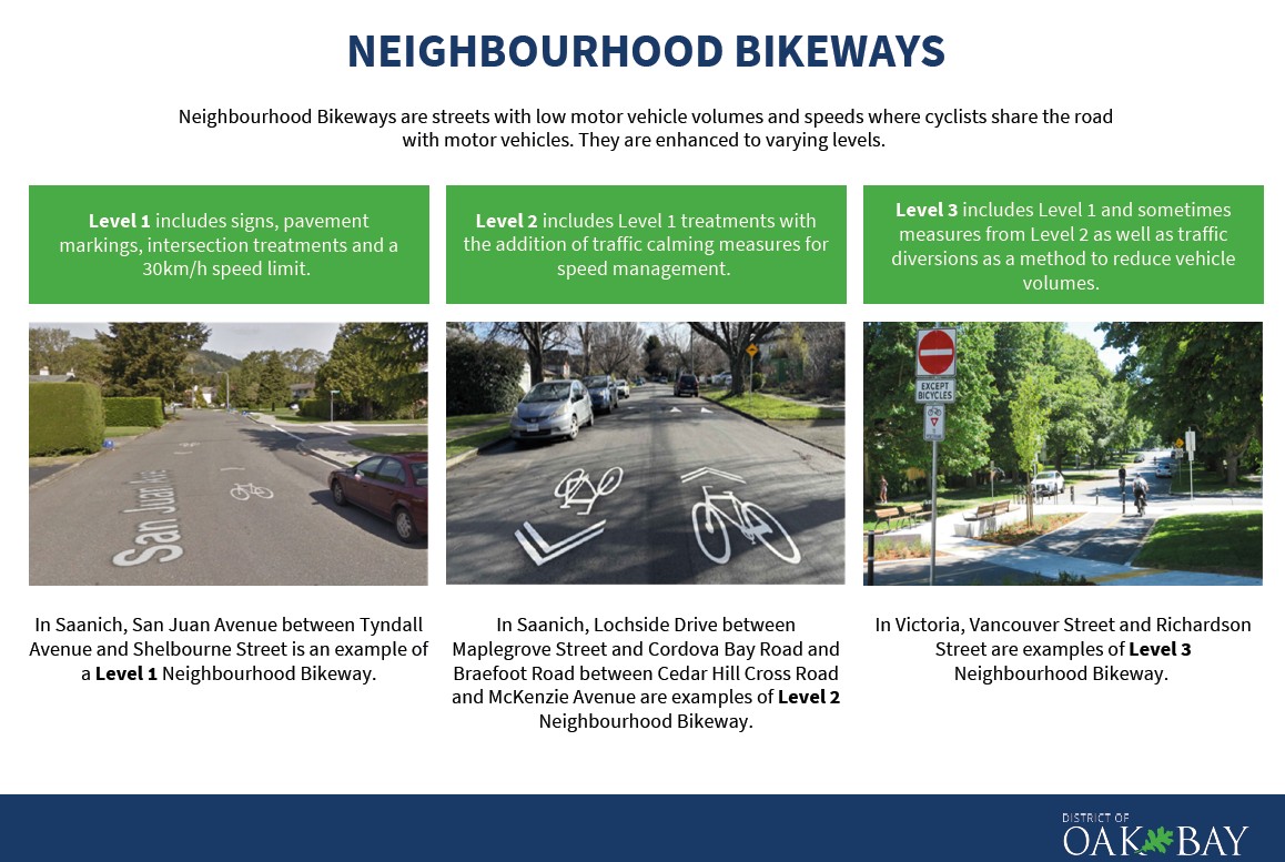 Neighbourhood bikeways include signs, pavement markings and traffic calming measures for speed management. Generally, bikeways have low motor vehicle volumes, where cyclists share the road with cars.